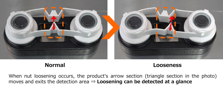 ・The indicator section moves in response to wheel nut loosening, and when the product arrow section moves out of the detection area, the angle of loosening requiring nut retightening can be accurately detected at a glance *Patent pending
