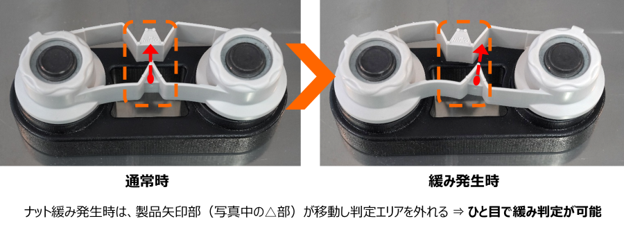 ・ホイールナットの緩みに応じてインジケーター部が可動し製品矢印部が判定エリアを外れることにより、ナットの増し締めが必要な緩み角度がひと目で正確に判定可能 ※特許出願中